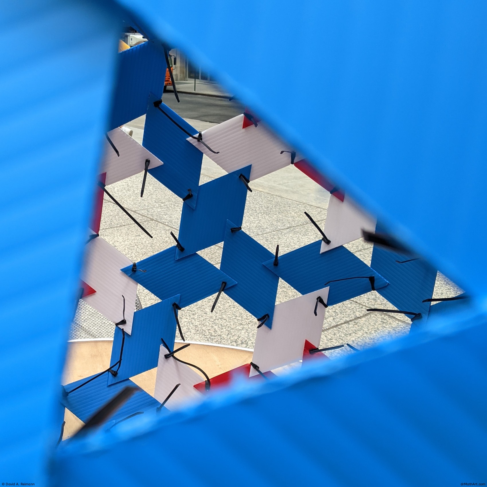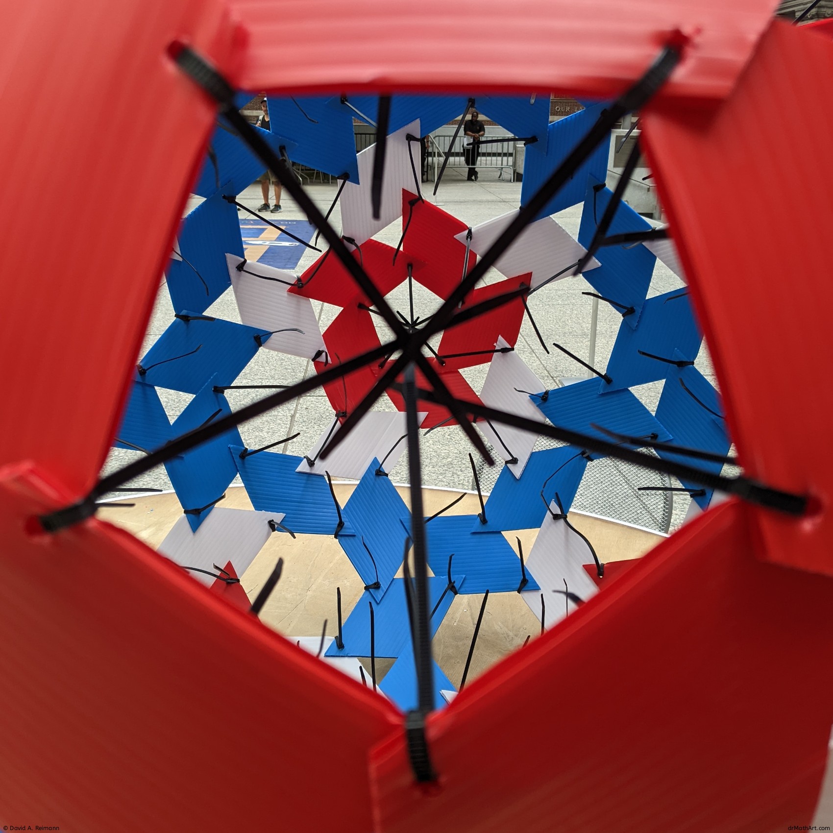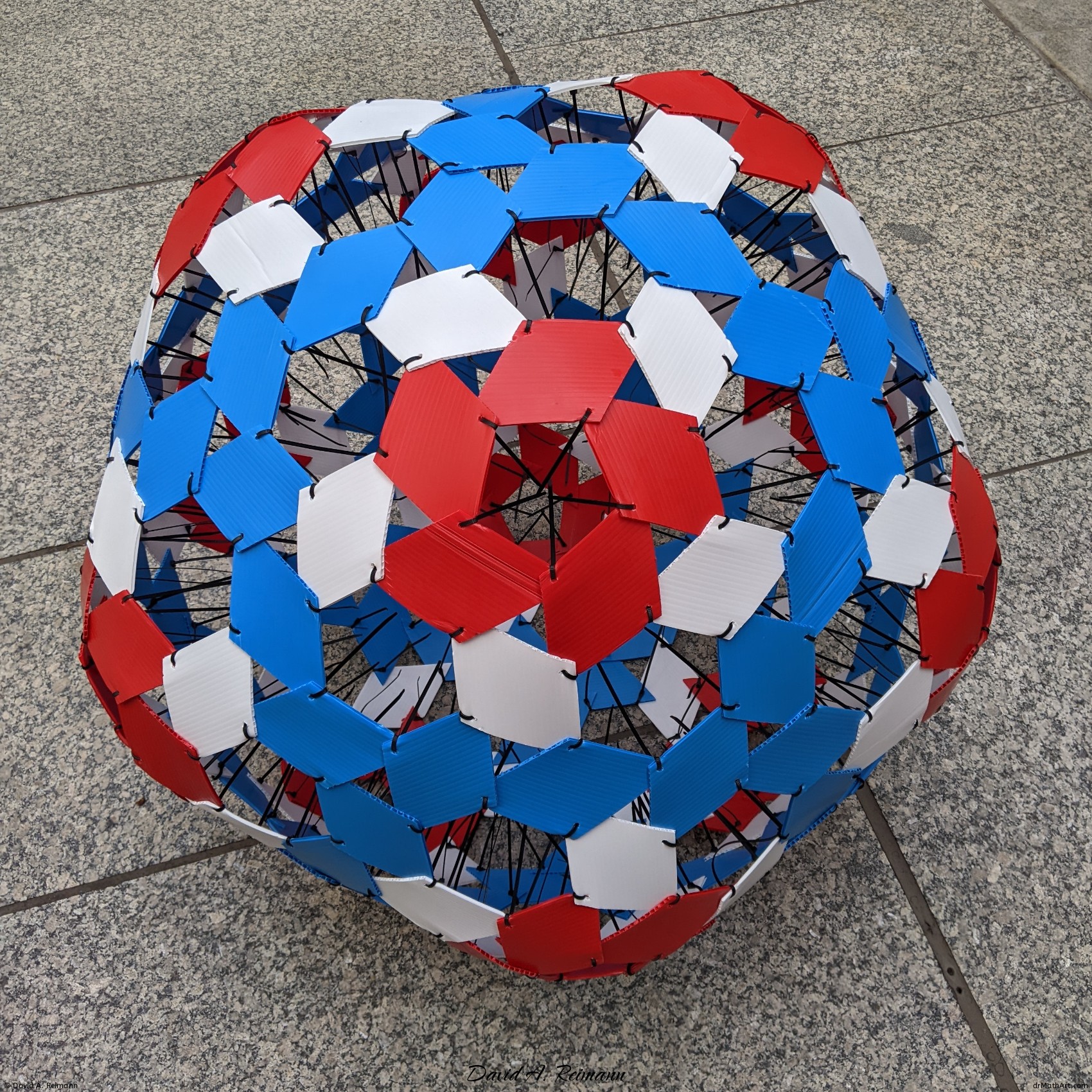 Mixed Media (corrugated plastic, cable ties) Sculpture 2023This work is based on the 2,1-Goldberg polyhedron where the edges have been replaced with rhombic pieces of colored corrugated plastic.
