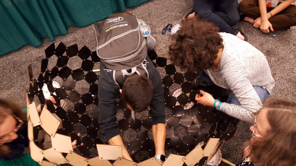 This was the result of a hands-on mathematical art sculpture construction I was commissioned to lead at the Joint Mathematics Meetings in Atlanta, Georgia on January 5, 2017. Conference attendees, mostly college faulty and students, helped assemble this piece during a community event sponsored by the Special Interest Group of the Mathematics Association of America on Mathematics and the Arts (SIGMAA-ARTS). Following the assembly activity, the piece was donated to the STEM Discovery Center at Piedmont College in Demorest, Georgia.