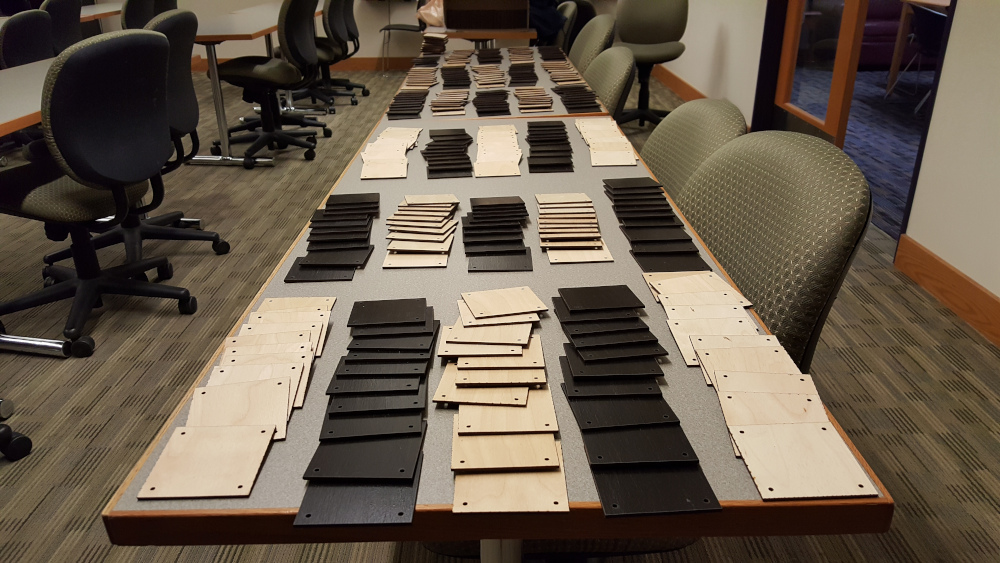 A total of 390 laser-cut plywood (1/4") squares (4" x 4") were used in the construction. Twelve groups of five squares were connected into pentagonal units. These squares had kerf cuts laser cut to allow more flexibility. Small screws (6-32 x 3/8") and nuts were used as fasteners.