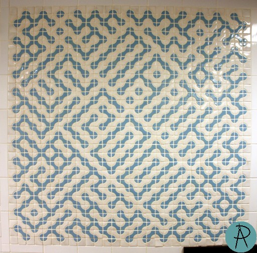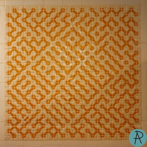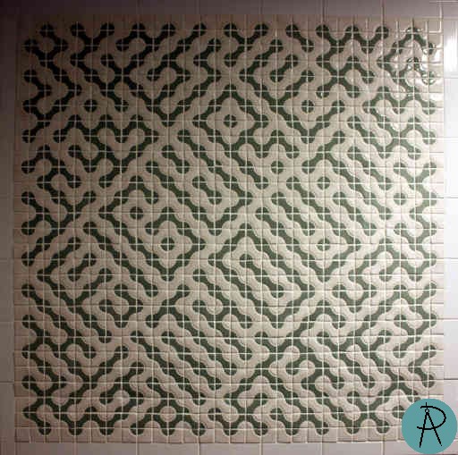 After my 2009 Bridges talk, George Hart decided to use this idea of text in Truchet tiles in the National Museum of Mathematics (MoMath), which was under construction at the time. These tiles were used as accents in the museum's restrooms.